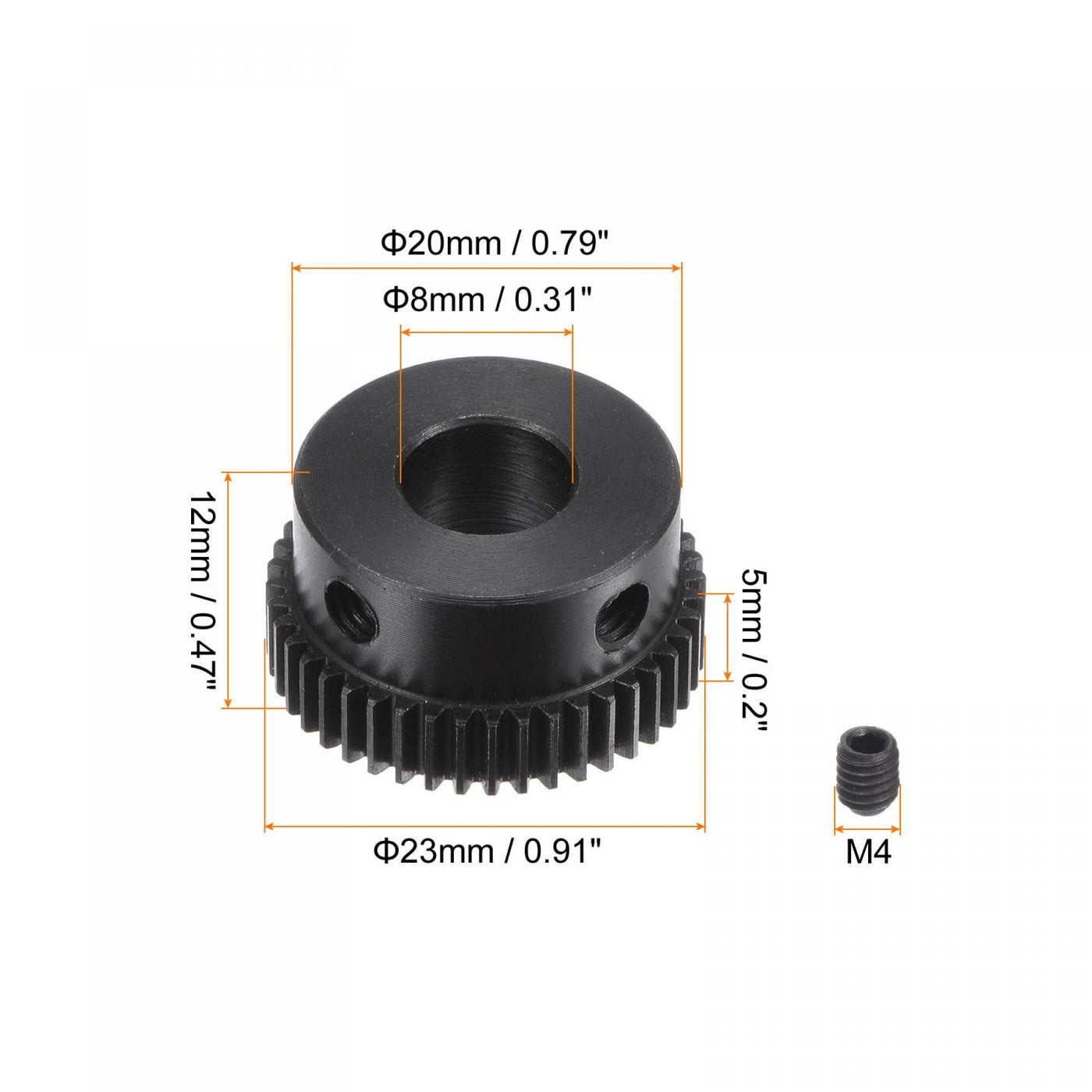 - Pinion Gear: Model: 0.5 Mod; Teeth: 44T; Bore Size (Shaft Dia.): 8mm / 0.31"; Outer Dia. (Teeth Part): 23mm / 0.91"; Effective Teeth Length: 5mm / 0.2"; Step Size: 20mm x 7mm / 0.79" x 0.28" (D*H)