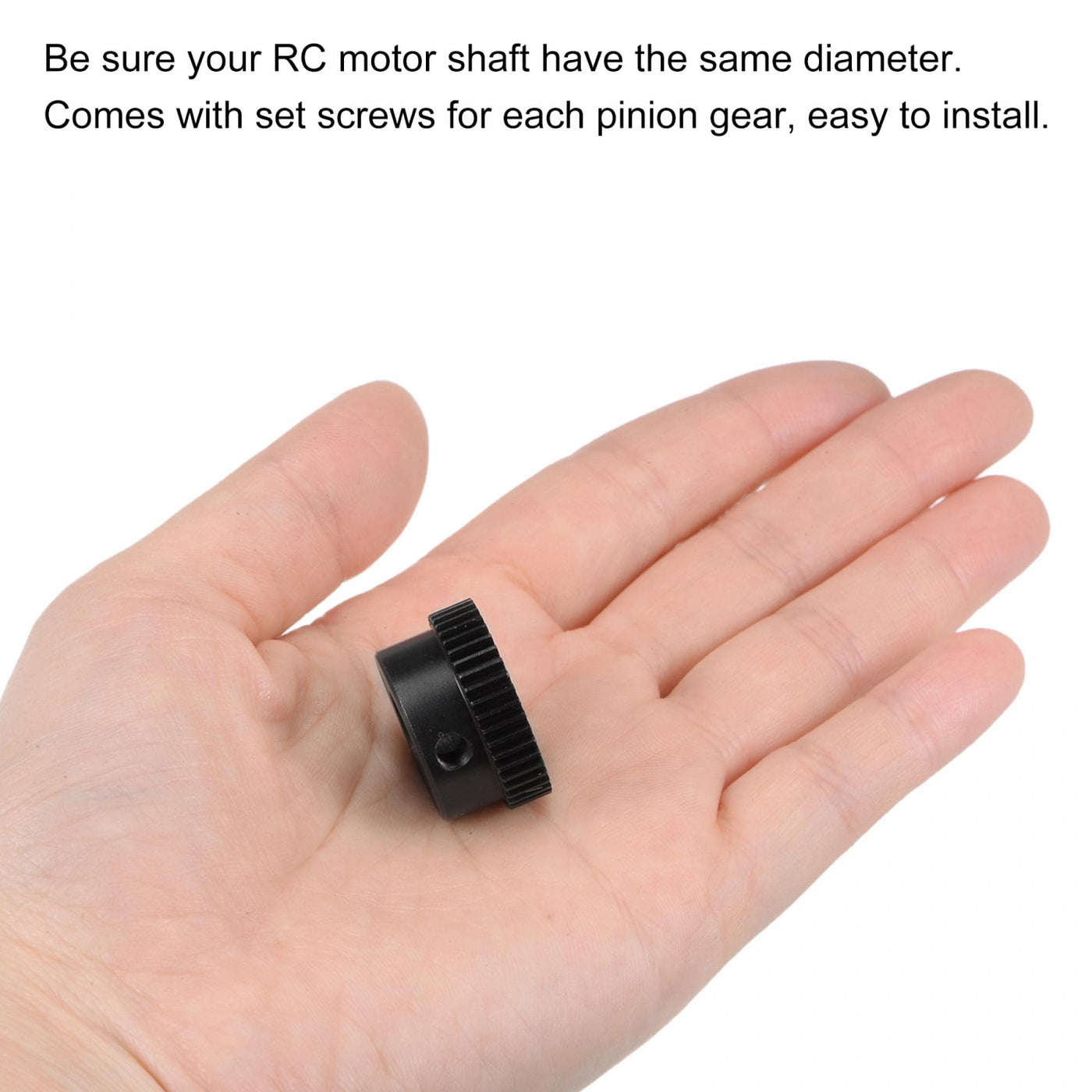 - Easy to Use: Be sure your RC motor shaft have the same diameter. Comes with set screws for each pinion gear, easy to install. Hardness of teeth surface: hard teeth surface.