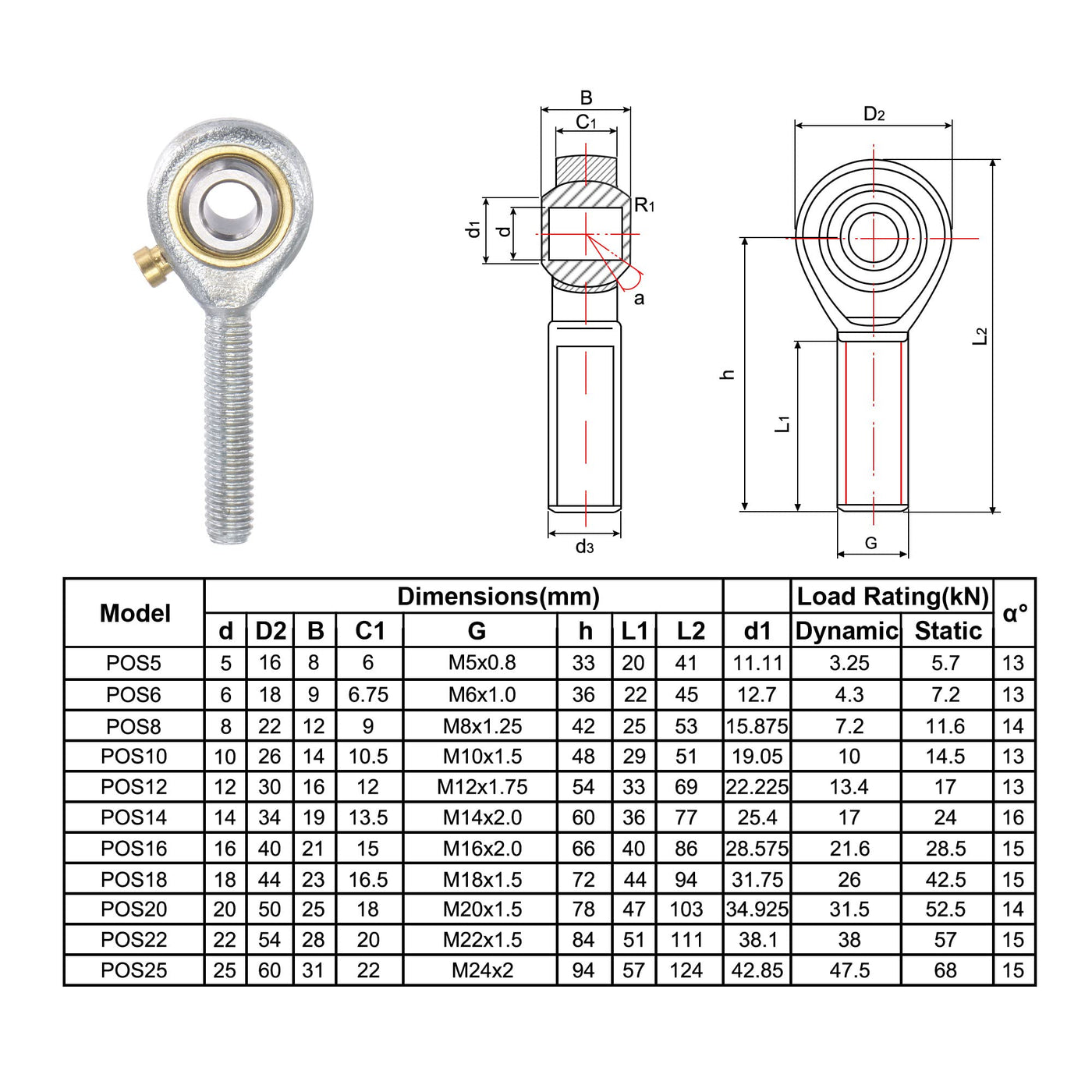 uxcell POS20 Spherical Rod End Bearing 20mm Bore Self-Lubricated Joint Bearing M20x1.5 Right Hand Male Thread Connector