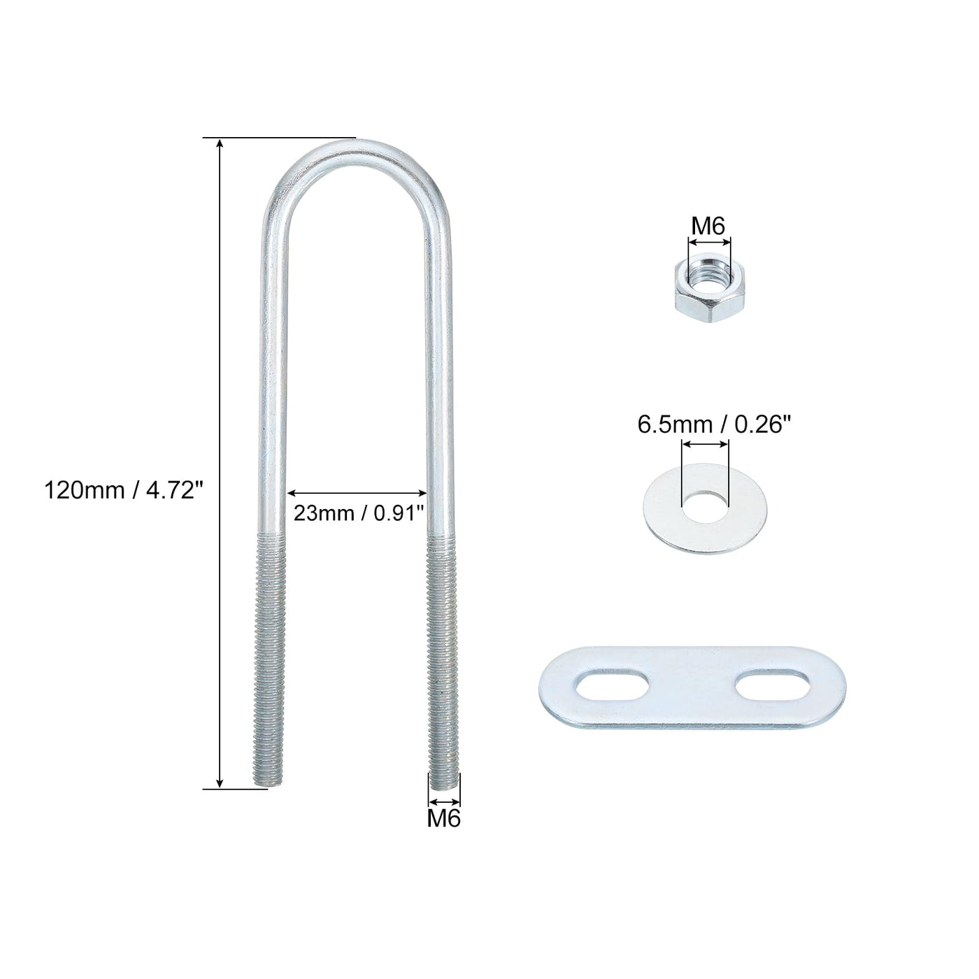 Description: 1. Material: These U-bolts are made of carbon steel material, the surface of which has a zinc-plated finish and a bending forming process. The surface is glossy and square and has high hardness not easy to rust, or deform and corrosion resistance, high strength, and excellent wear resistance. 2. Advantages: The thread is deep and clear, and it is not easy to slip. Plate and nuts are included to avoid being unable to secure during use. 3. Application: U-shaped Bolt is used to fix or connect the locked parts to pipes, wood, etc. Suitable for automobile trailers, ski boats, or sailboat trailer boats, plumbing, and other home and industrial applications. Specification: Product Name: U-Bolt Material: Carbon Steel Finish: Zinc-Plated Thread Dia.: M6 Inner Width: 23mm / 0.91" Total Length: 120mm / 4.72" Rod Diameter: 5.2mm / 0.2" Hex Nut Thread Dia.: M6 Frame Plate Dia.: 6.5mm / 0.26" Package Content: 1 x U-Bolt, 2 x Nuts, 1 x Plates, 2 x Gasket.