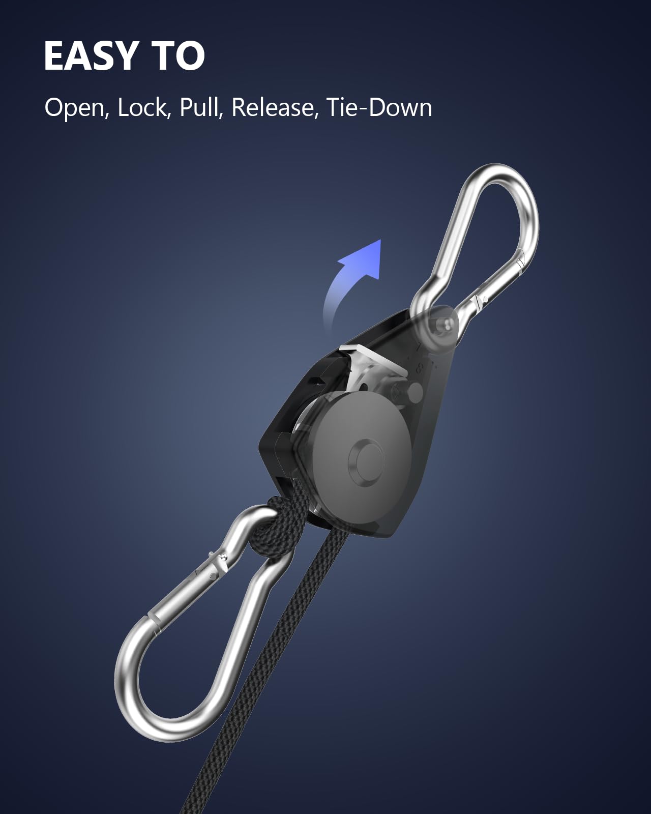 VIPARSPECTRA Retractable Heavy Duty Ratchet Tie Down Straps [4 Pack, 8ft, 75lbs/Pack], Rope Pulley System with Carabiner Hook for Hanging Plants/Grow Light/Tents Various Tie-Down Uses