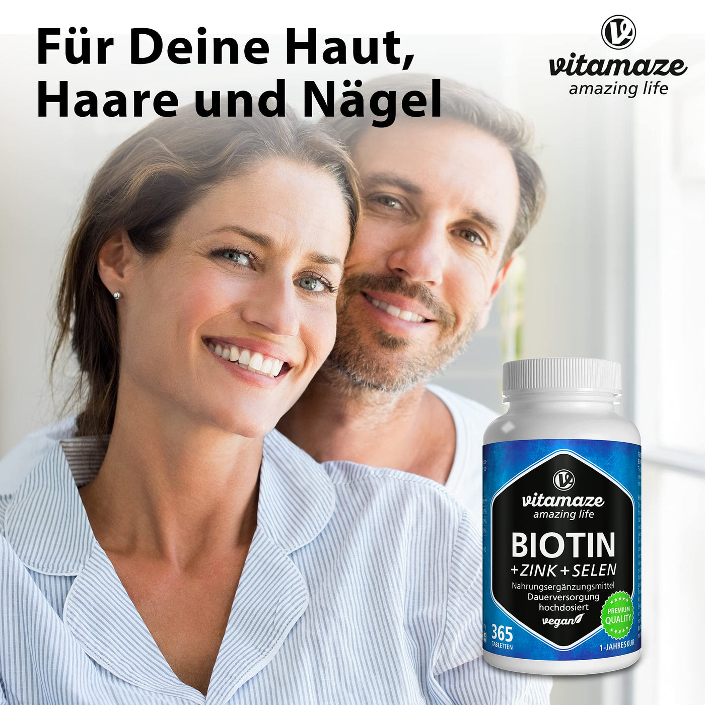 Our “Vitamaze | Amazing life” brand is synonymous with well-being and an active lifestyle. It is the ideal range for anyone wanting to live a calm yet energised life. The high-dosage vitamins, minerals and plant extracts systematically help to naturally maintain many different body functions. All the food supplements we offer meet the stringent Vitamaze guidelines. We work closely with scientists and experts when developing our own products. In all our products, you will find that the quality of raw materials used is first class. All products are as pure and natural as possible and many are therefore suitable for people with allergies as they don't contain unnecessary allergens. Nearly all products are vegan or vegetarian and do not contain the anti-adherent magnesium stearate in order to provide good bioavailability. Read more Biotin Biotin is also known as vitamin B7 or as part of the vitamin B complex. Our biotin was produced with natural raw materials, making it easier for the body to process the vegan tablets. Biotin high strength + zinc + selenium tablets vegan A potent combination of essential vitamins for skin, hair growth and nails! High strength with 10.000 µg Biotin (10 mg) in one tablet. One small tablet a day of the water-soluble vitamin B7 is all you need to benefit from the ideal combination of biotin with zinc and selenium. An overdose is not possible because the excess ingredient is naturally excreted by the body. 10 mg of zinc und 55 µg of selenium per tablet meet 100% of the necessary daily dose with the best bioavailability. 10.000 µg Biotin with 10 mg zinc and 55 µg selenium in one tablet 365 vegan tablets for an uninterrupted 1-year supply Without coating, easy-to-swallow or to ground into a powder Read more For allergy sufferers, vegans and vegetarians Free from unnecessary additives VEGAN: Made from non- animal ingredients and free from unnecessary additives. BEST BIOAVAILABILITY: Without the release agent magnesium stearate (magnesium salts of fatty acids) to maintain the ideal effectiveness. Please inform yourself about magnesium stearate and its effects. FREE FROM: Without genetically modified ingredients, pesticides, fungicides, artificial fertilisers or other harmful substances. SUITABLE FOR PEOPLE WITH ALLERGIES: Free from gluten, lactose or other allergens Made in Germany Produced in Germany following the HACCP concept. registered by the Federal Office for Consumer Protection and Food Safety (BVL) Unrestricted marketability has been confirmed by an independent tester. Read more Biotin and Zinc contributeto the maintenance of normal skin Biotin contributes to normal psychological functionBiotin contributes to a normal function of the nervous systemBiotin contributes to the maintenance of normal mucous membranes Biotin, Zinc and Selenium contribute to the maintenance of normal hair Zinc contributes to the maintenance of normal bonesZinc contributes to the maintenance of normal visionZinc contributes to the maintenance of a normal immune system Zinc and Selenium contribute to the maintenance of normal nails Selenium and Zinc contribute to the normal function of the immune systemSelenium contributes to the normal thyroid functionSelenium contributes to the protection of cells from oxidative stress Read more MSM + Vitamin C OPC + Vitamin C Vitamin B Complex Multivitamin Daily Dosage: 1.334 mg MSM powder 450 mg pure OPC with 8 B Vitamins 23 Valuable A-Z Vitamins and Minerals + Trace Elements Contents: 360 capsules 180 capsules 180 Tablets 120 Tablets Duration: 6 month treatment 6 month treatment 6 month treatment 4 month treatment Vegan: ✓ vegetarian