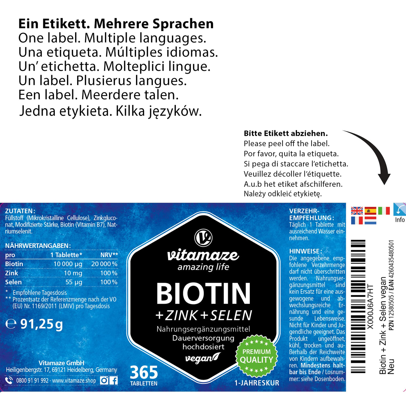Vitamaze® Biotin 10000 mcg High Dose + Selenium + Zinc for Hair Growth, Skin and Nails, 365 Vegan Tablets for 1 Year, German Quality, No Unnecessary Additives