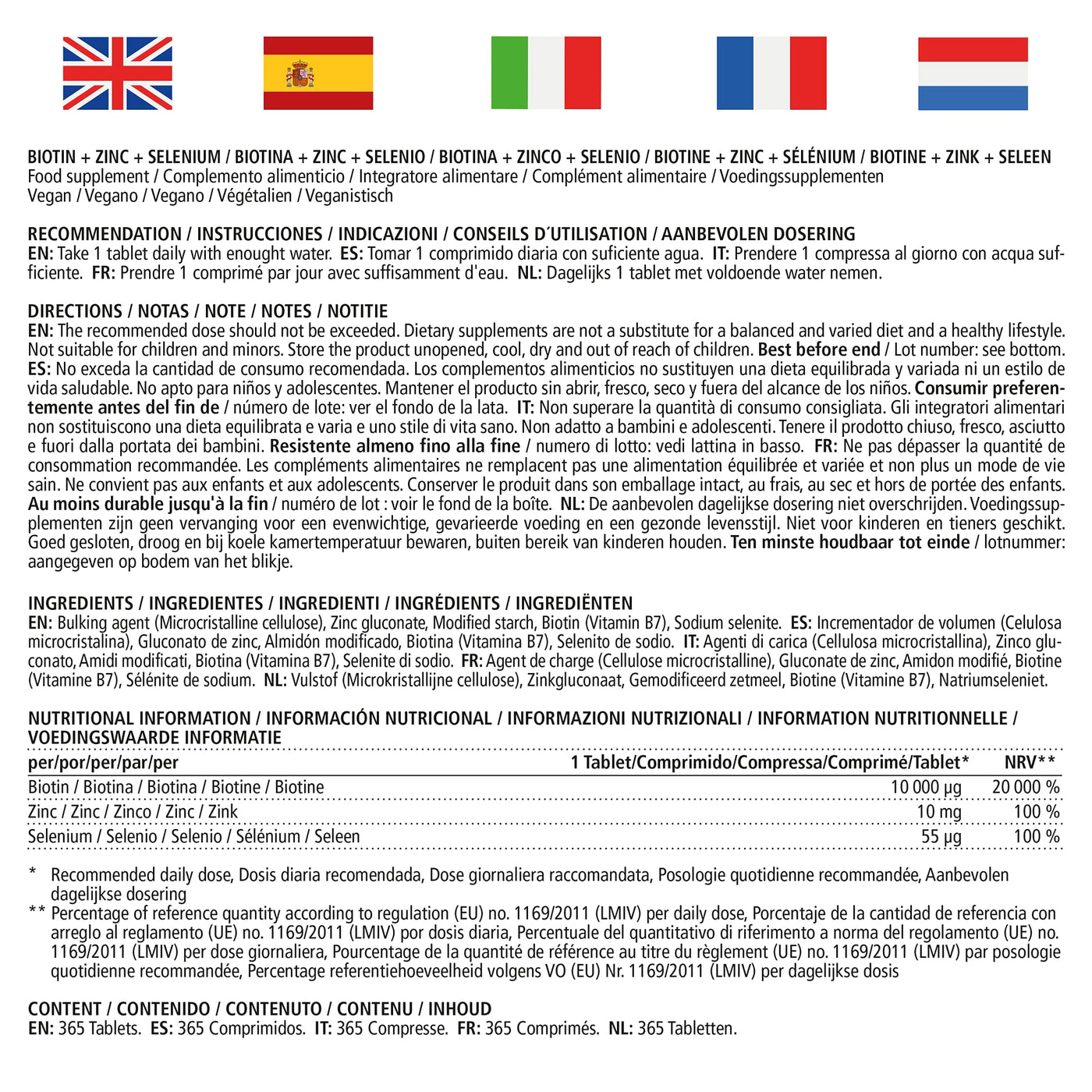 - HIGH DOSE: 365 small, vegan tablets for 1 year for continuous use with 10,000 mcg biotin supplemented with zinc and selenium the ideal combination for skin, hair growth and nails.