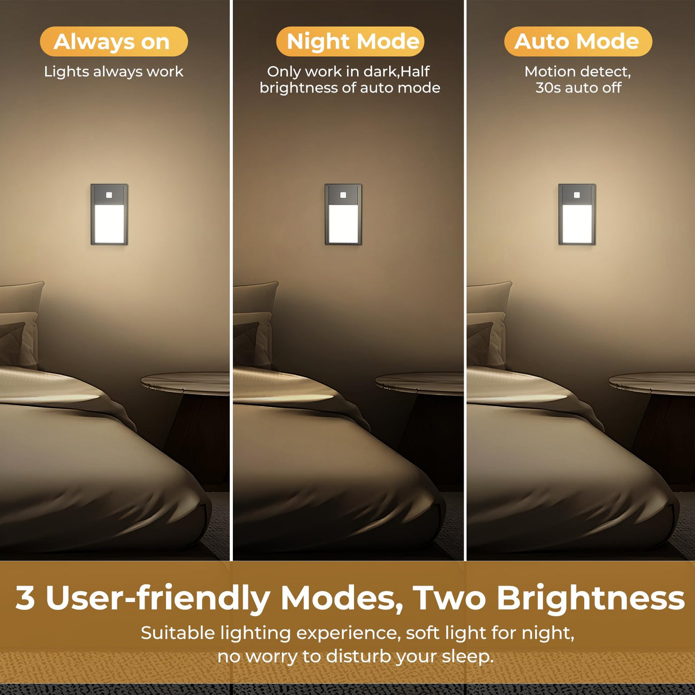 - 4 Modes & 2 BrightnessHas 4 switch control modes: ON/OFF/Auto Mode/Night Mode. ON: Keep it lit, last 3-5 Hours; OFF: Turn Off. Auto Mode: Auto on both in day and night,auto off after 30S of inactivity; Night Mode: Only auto on in dark, auto off after 30S of inactivity.(When in night mode, the brightness is only half that of auto mode)