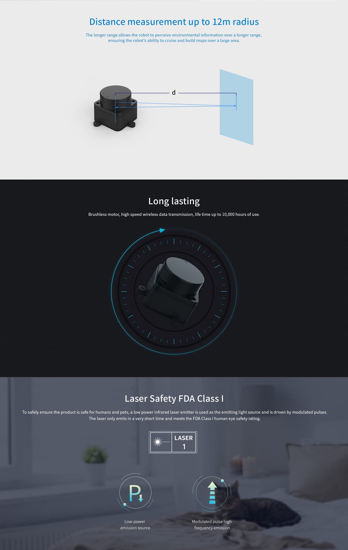 - [Widely Application] It can be used for home service/cleaning robot navigation and localization, general robot navigation and localization, smart toys localization and obstacle avoidance, environment scanning and 3D re-modeling, General simultaneous localization and mapping (SLAM), etc.