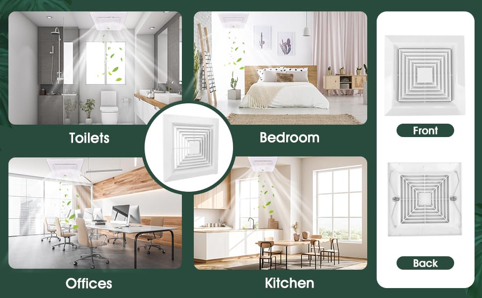 - (Ideal choice for home furnishings) : The exhaust fan cover is a classic white with a variety of ceiling colors The color fits seamlessly, ensuring practicality and perfection. It fits perfectly for square ceilings or wall-mounted exhaust fans, bathroom fans, and ventilation fans, which can also be used as air diffusers or Ceiling air diffuser. Let me know if you have any questions.