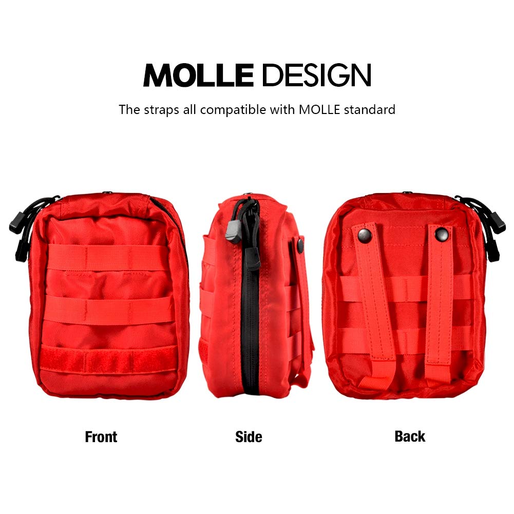 - [Standard Molle Strap]: Tactical medical first aid bag MOLLE EMT with standard MOLLE straps and strong snap fasteners that allow you The medical pouch can be attached to any MOLLE compatible device (for carrying on belt, vest or backpack).